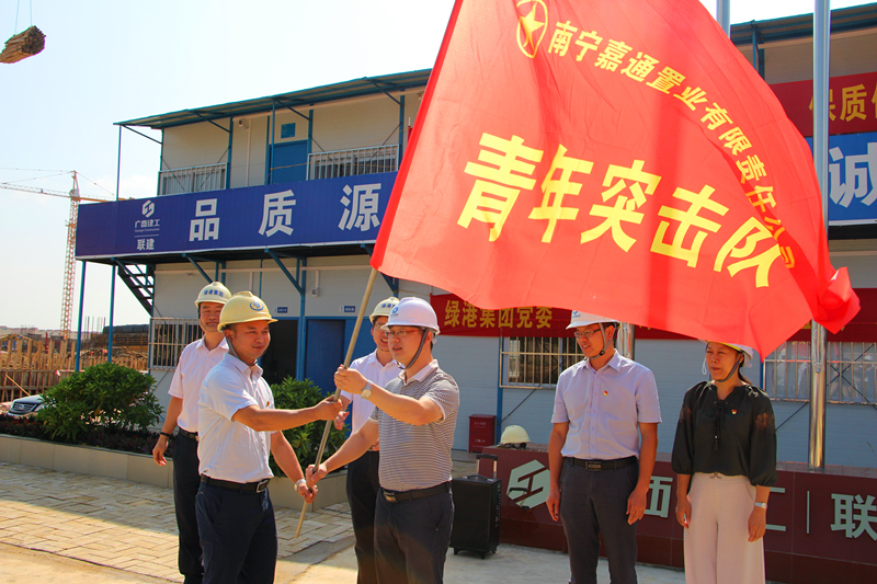 在授旗儀式中,集團黨委書記、董事長、總經(jīng)理龔國強對南寧科技產(chǎn)業(yè)園項目人員前期所做出的工作給予了充分肯定,贊揚了黨員先鋒隊員、青年突擊隊員和工人朋友們?yōu)轫椖拷ㄔO(shè)所付出的艱苦和努力,當前項目進展取得了較好的成績。自8月12日南寧科技產(chǎn)業(yè)園項目正式開工以來,嘉通公司黨支部帶領(lǐng)工人們?nèi)找箍喔?,千方百計克服惡劣的臺風天氣等不利因素,在短短的2個月時間便完成1#樓廠房一層的搭設(shè)模板,2#、3#樓回填基礎(chǔ)土方,4#樓防水保護層澆筑以及9#宿舍樓基礎(chǔ)承臺澆筑等工作,充分展現(xiàn)了綠港鐵軍風采。下一步,希望全體黨員先鋒隊、青年突擊隊隊員們以此次授旗為契機,繼續(xù)發(fā)揚綠港鐵軍精神,創(chuàng)先爭優(yōu),攻堅克難,加快推進項目建設(shè),確保項目如期建成交付。