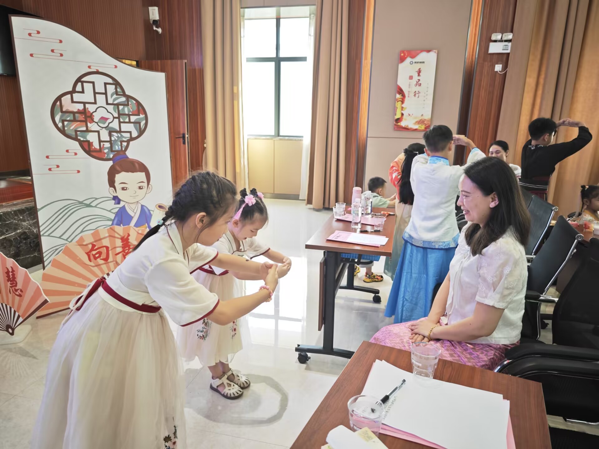 活動(dòng)以傳統(tǒng)禮儀的學(xué)習(xí)和體驗(yàn)為主題,此次培訓(xùn)邀請(qǐng)了廣西經(jīng)貿(mào)職業(yè)技術(shù)學(xué)院智慧商務(wù)產(chǎn)業(yè)學(xué)院的老師韋斯斯講授少兒禮儀知識(shí)。活動(dòng)中,韋老師向孩子們講解了《弟子規(guī)》中學(xué)習(xí)的重要、做人的道理以及待人接物的禮貌常識(shí),讓大家更好地理解傳統(tǒng)的禮儀。韋老師親身示范,教授大家如何正確行認(rèn)知禮儀、家庭禮儀、餐桌禮儀、待客禮儀、交往禮儀、入泮禮、作揖禮、孝道禮儀等,在抬手躬身中感受禮儀之邦的古韻,學(xué)習(xí)尊師重教的品德。韋老師結(jié)合理論知識(shí)學(xué)習(xí),邀請(qǐng)孩子們上臺(tái)實(shí)操演練,模擬情景表演、開展親子互動(dòng)小游戲等,孩子們紛紛上臺(tái),為大家展示,將學(xué)到的文明禮儀知識(shí)落實(shí)到行動(dòng)中,培訓(xùn)現(xiàn)場(chǎng)生動(dòng)形象、氣氛熱烈,孩子們?nèi)褙炞⒙犎±蠋煹闹v解,依照老師的示范,認(rèn)真的學(xué)習(xí)禮儀,體驗(yàn)傳統(tǒng)禮儀。